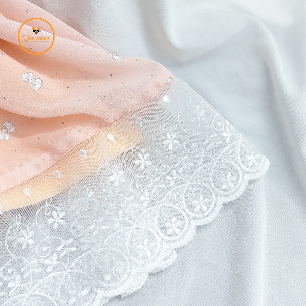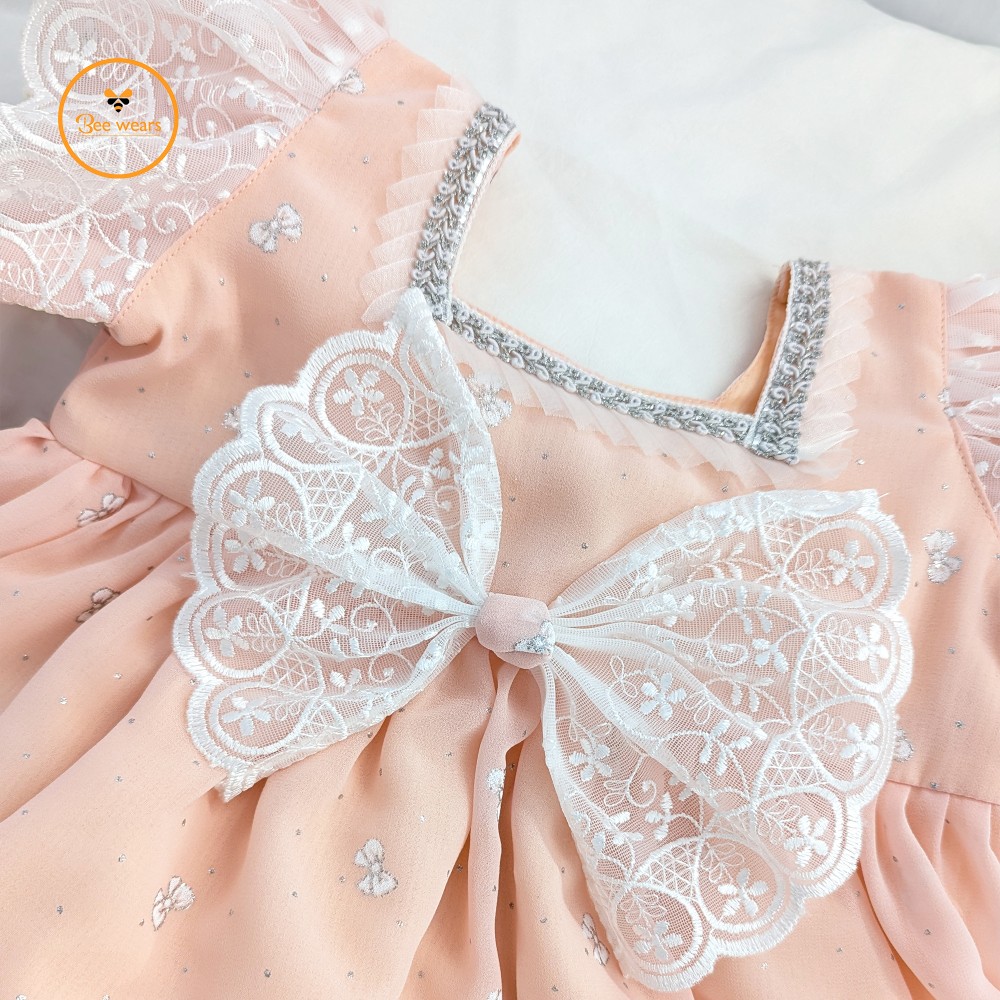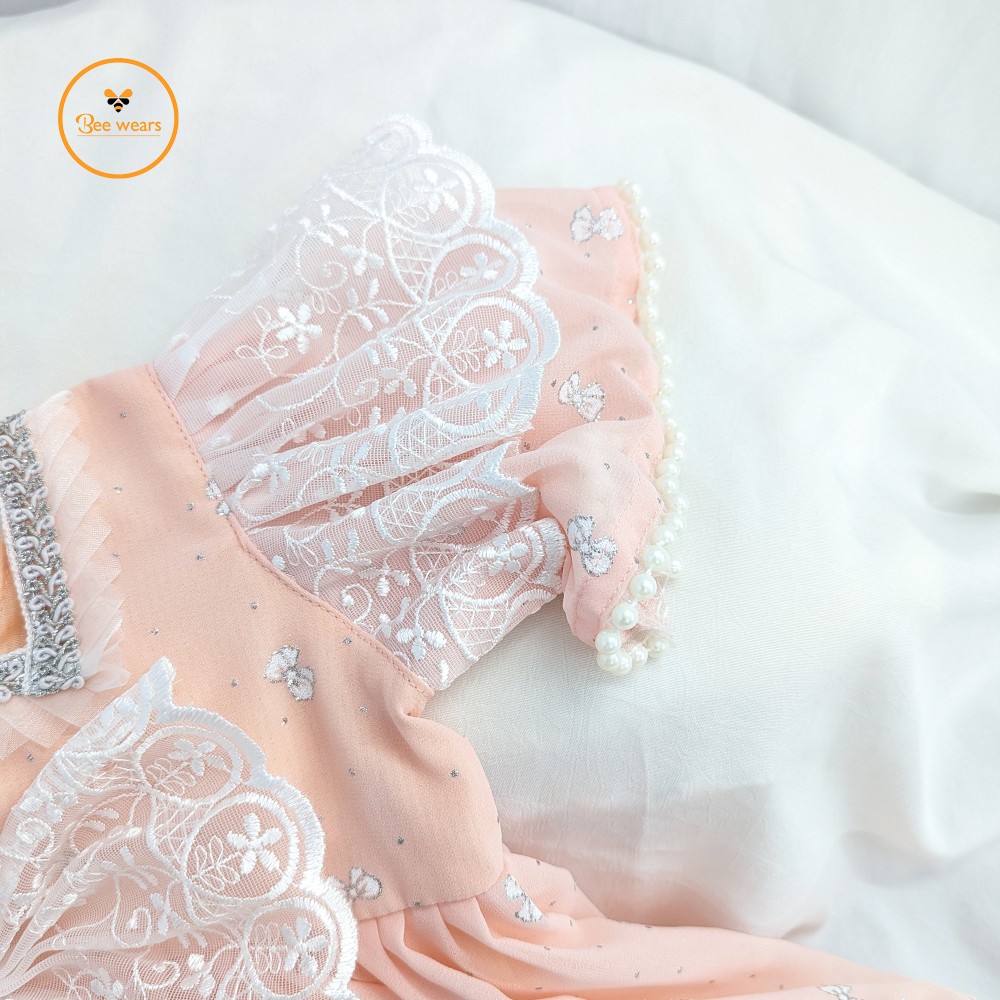 Designed with half sleeves, the dress comes with a charming matching koti adorned with two bow appliqués, enhanced with gorgeous lace detailing for a refined and elegant look. The hemline is beautifully finished with pearl lace, adding a premium and classy touch.